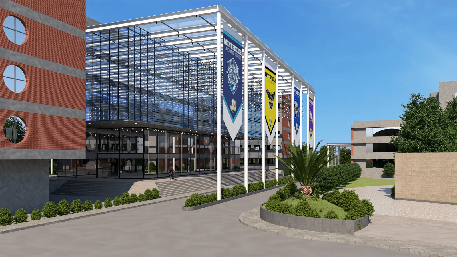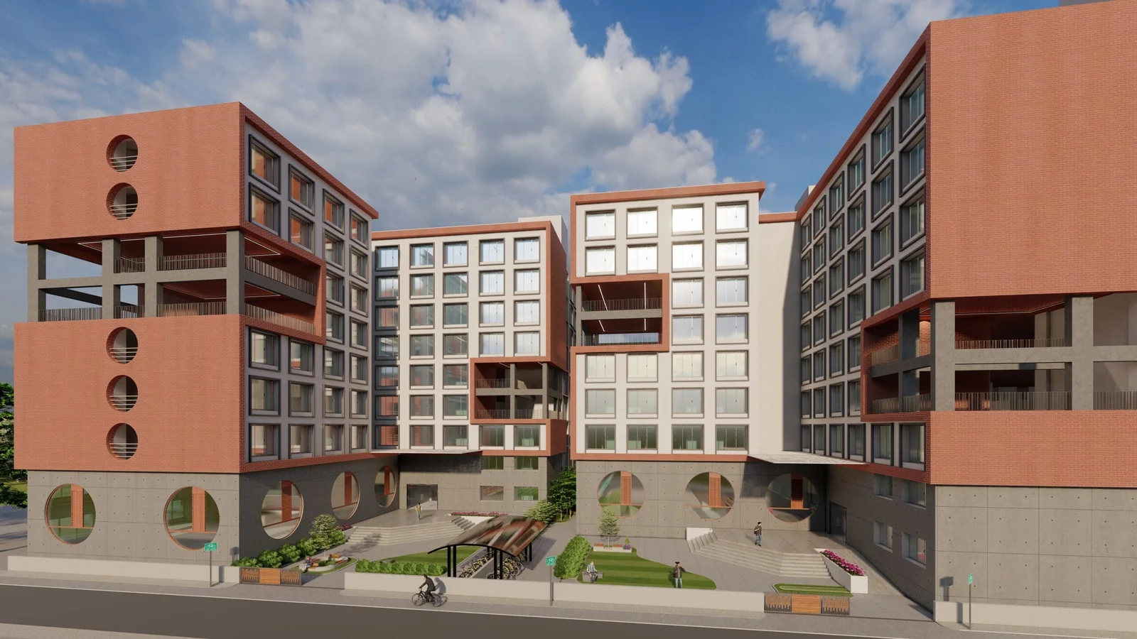 The hostel buildings are modern and dynamic, with a blend of brick and glass. The design emphasizes natural light and community, offering a comfortable, well-designed living space for students.