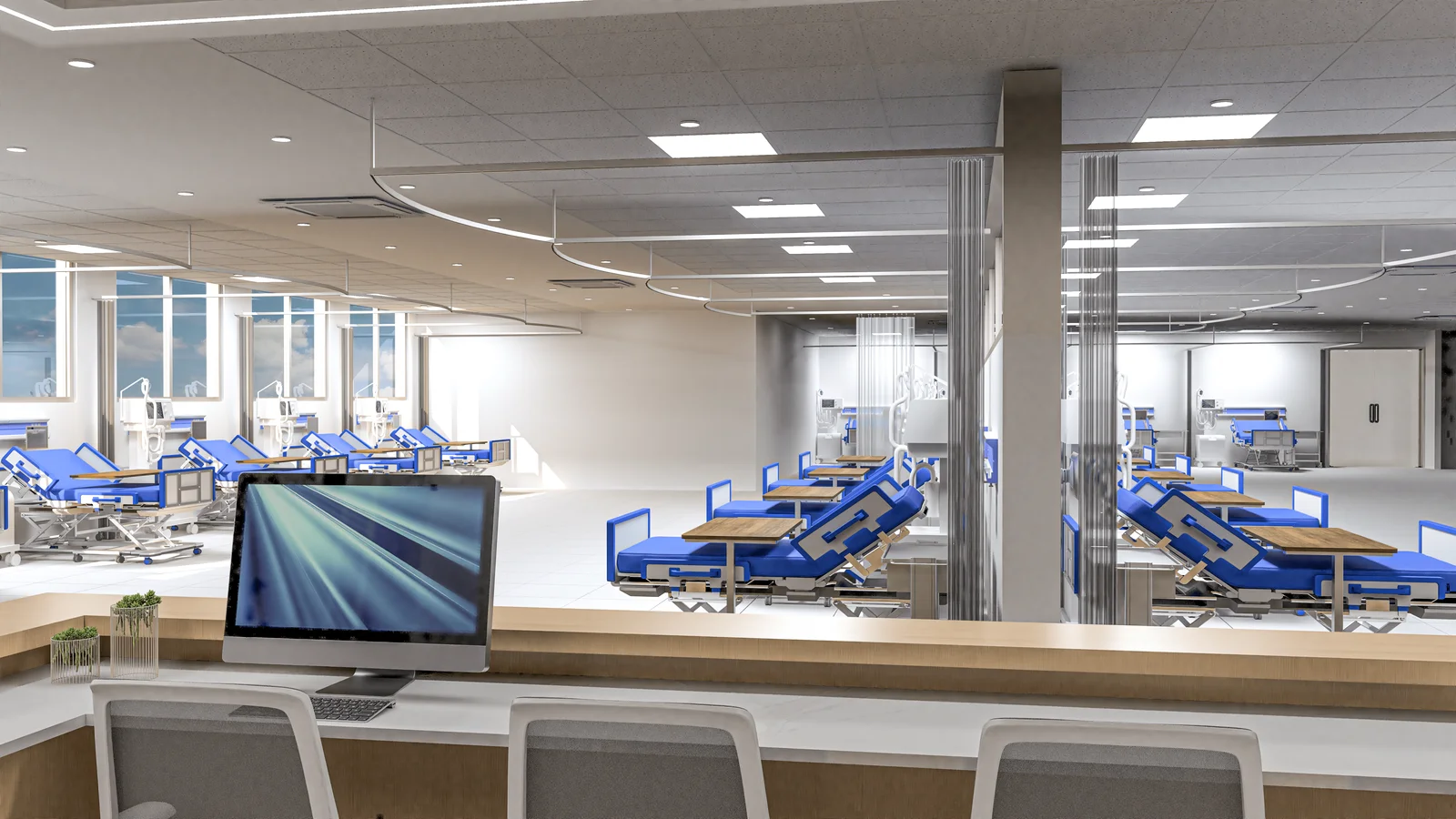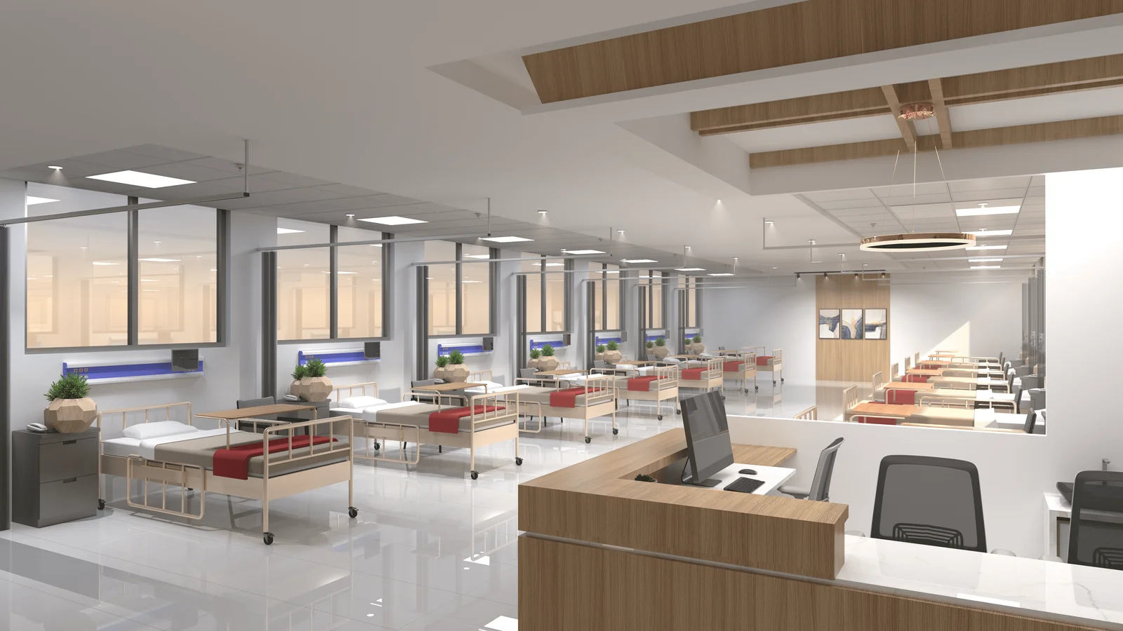 The emergency ward is bright and open, with a clean aesthetic that reduces stress. The efficient layout and natural light from large windows create a calm, organized environment, prioritizing patient well-being and staff accessibility.