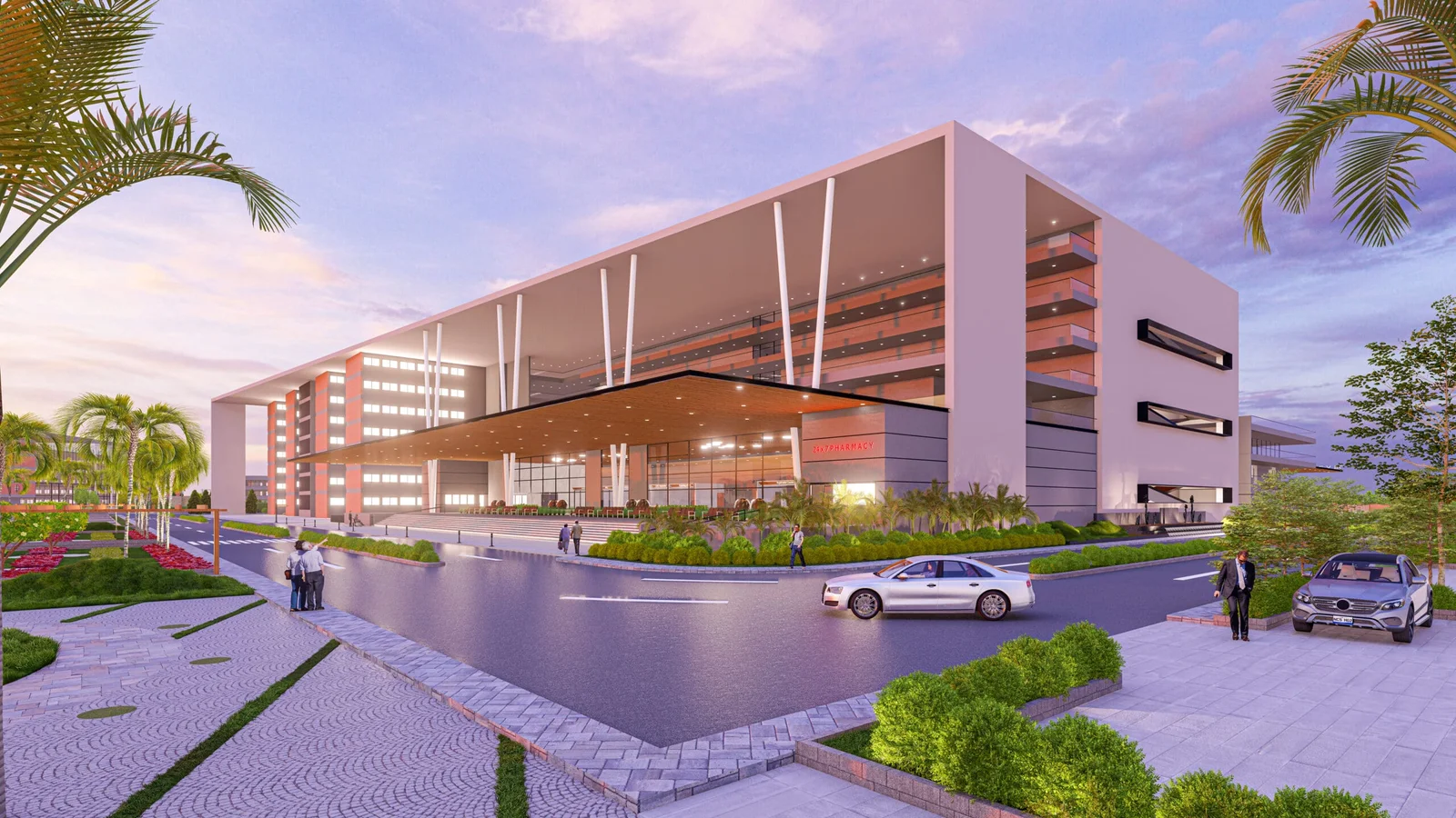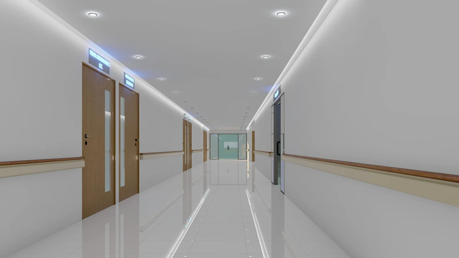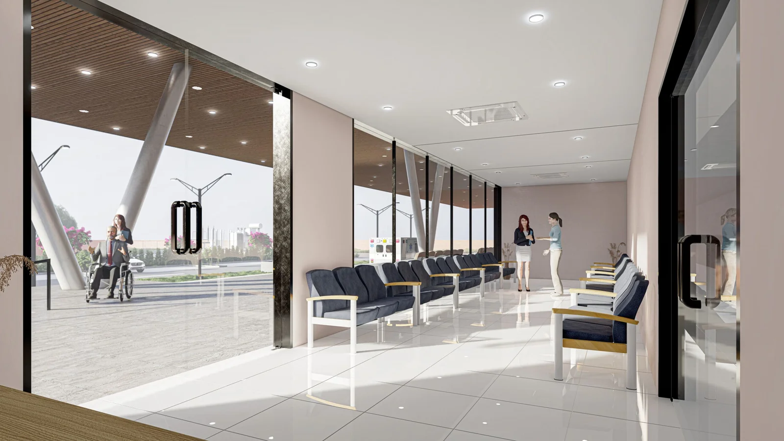 The reception is a welcoming atrium with flowing lines and a serene palette. Integrated planters and layered lighting create a calming atmosphere, while intuitive signage guides patients seamlessly, transforming the space from a waiting room into a therapeutic environment.