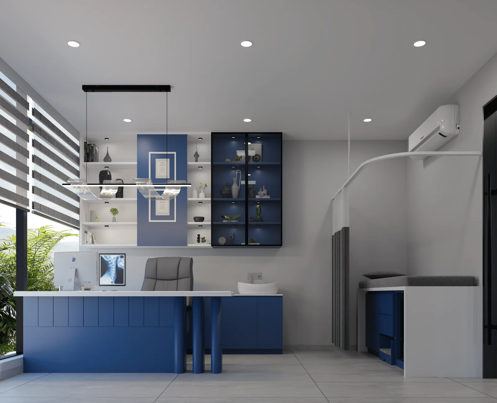 The Main Reception area is a masterclass in functional and aesthetic design. The space is dominated by a long, clean-lined reception counter with a bold blue and white color scheme that feels both professional and calming. The backdrop is a clean, white wall with subtle vertical grooves and integrated lighting that highlights the “Rotary Multi-Speciality Hospital” logo. The space is open and airy, with a high ceiling that features subtle lighting details, creating a feeling of spaciousness. The seating is arranged in a linear fashion, with rows of ergonomic chairs that ensure a smooth flow of traffic and efficient queue management. This design prioritizes clarity and efficiency, ensuring a stress-free experience for patients and visitors.
