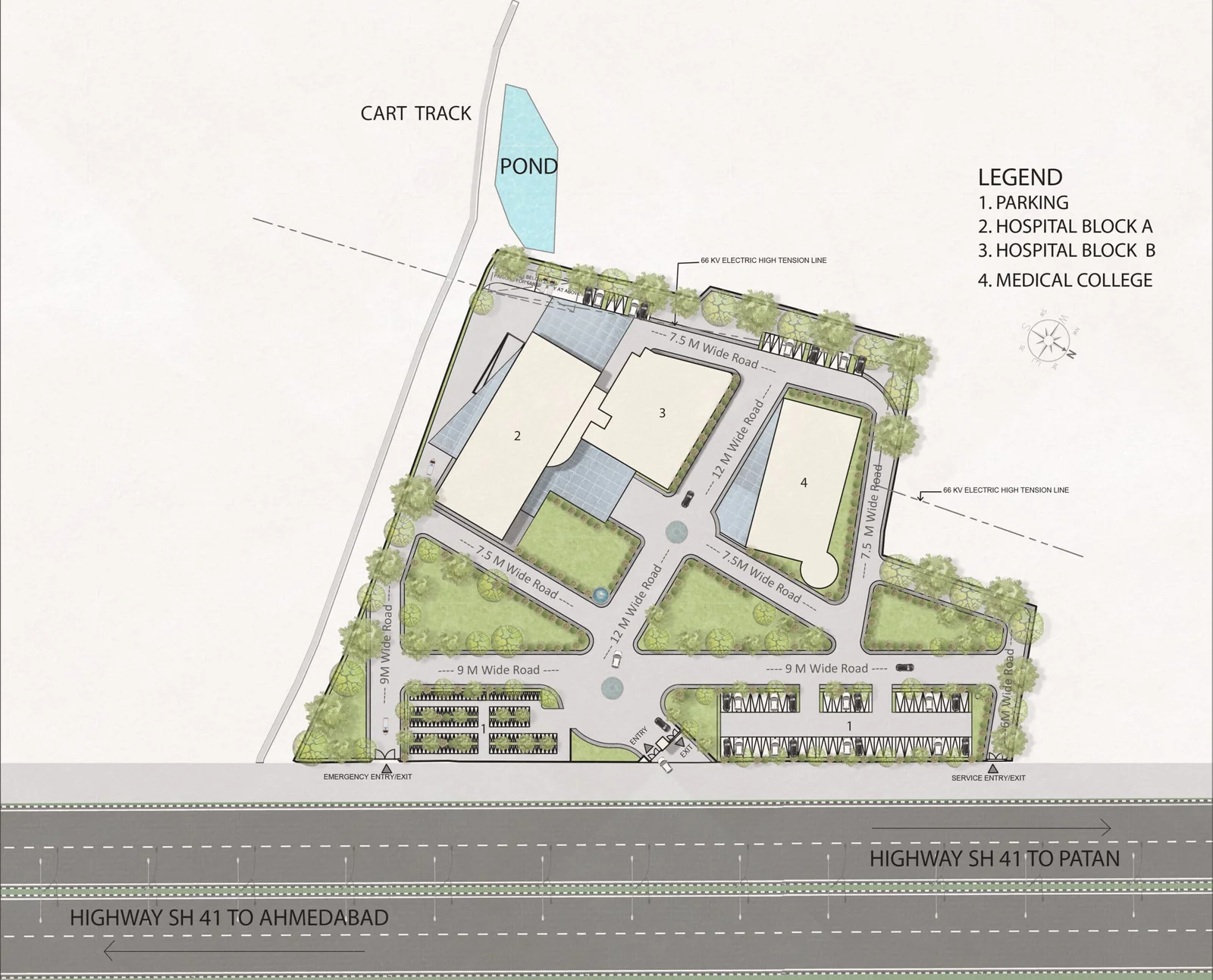The exterior of the Medical Hospital and College campus is a striking example of modern institutional architecture, spanning approximately 8,00,000 sq ft with a 450-bed capacity. The design is characterized by a bold, multi-story structure with a dynamic interplay of contrasting materials and forms. The facade features sleek black paneling and extensive glass curtain walls that create a sense of transparency and openness. A central, curved glass atrium with cascading greenery acts as a vibrant focal point, while the strategic use of balconies and setbacks adds visual interest and rhythm to the building’s massing. The design is both imposing and inviting, with a welcoming entrance canopy and well-planned landscaping that includes palm trees and green spaces, reflecting the institution’s commitment to nature and well-being.