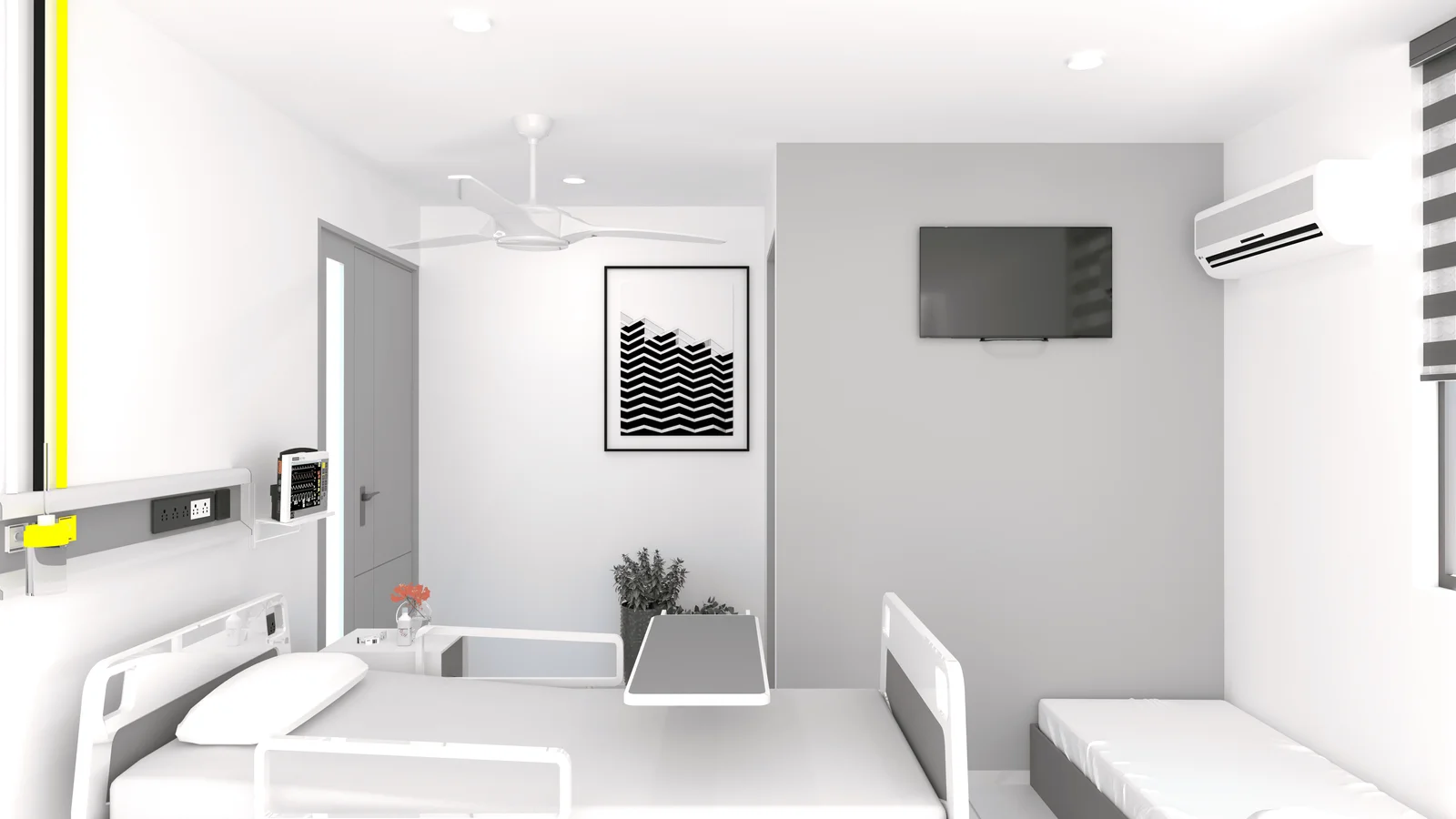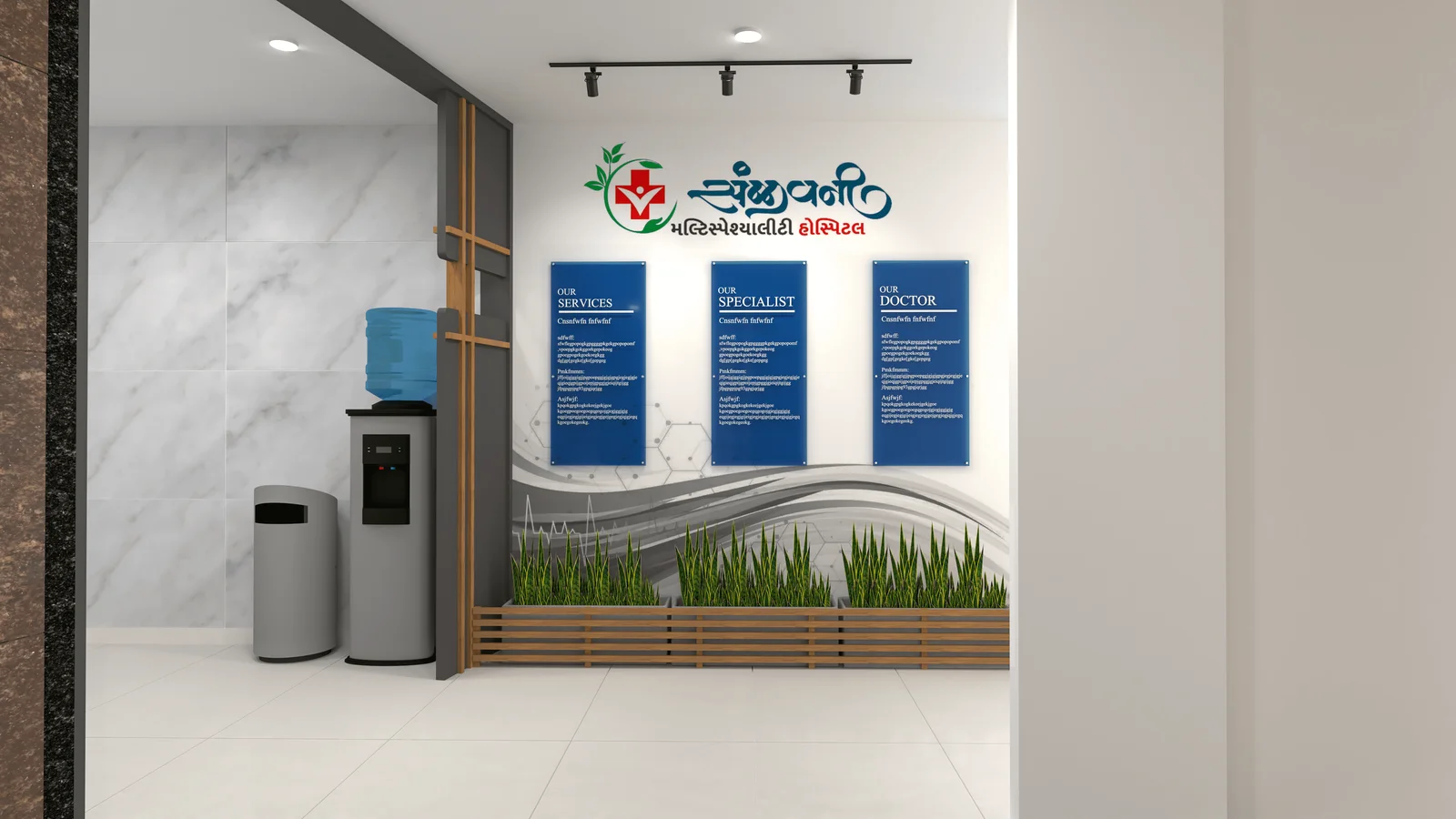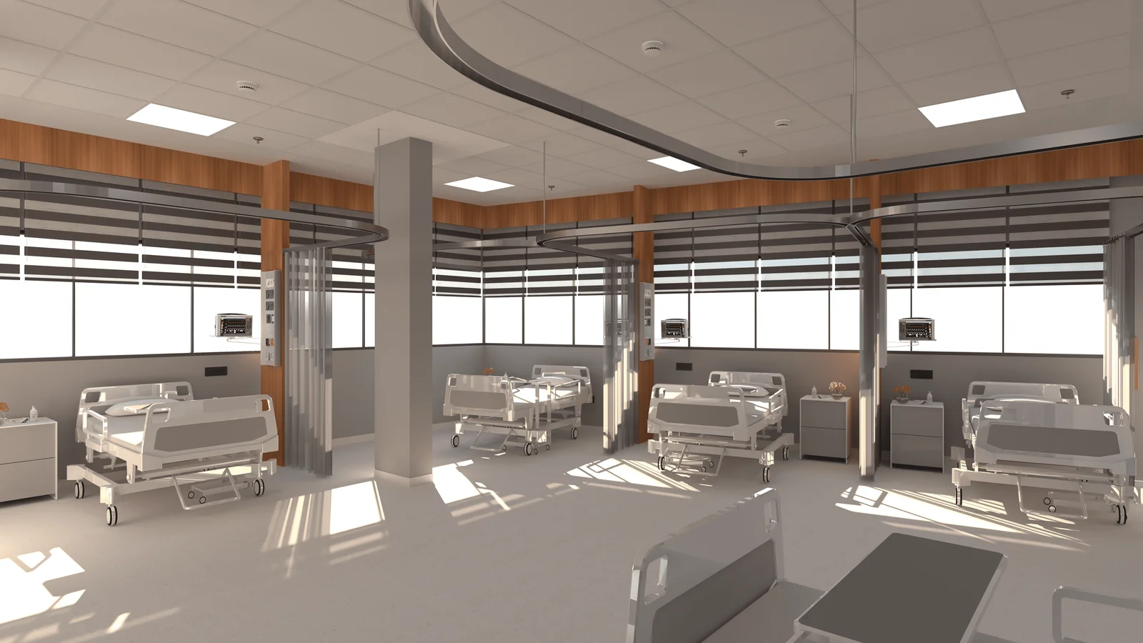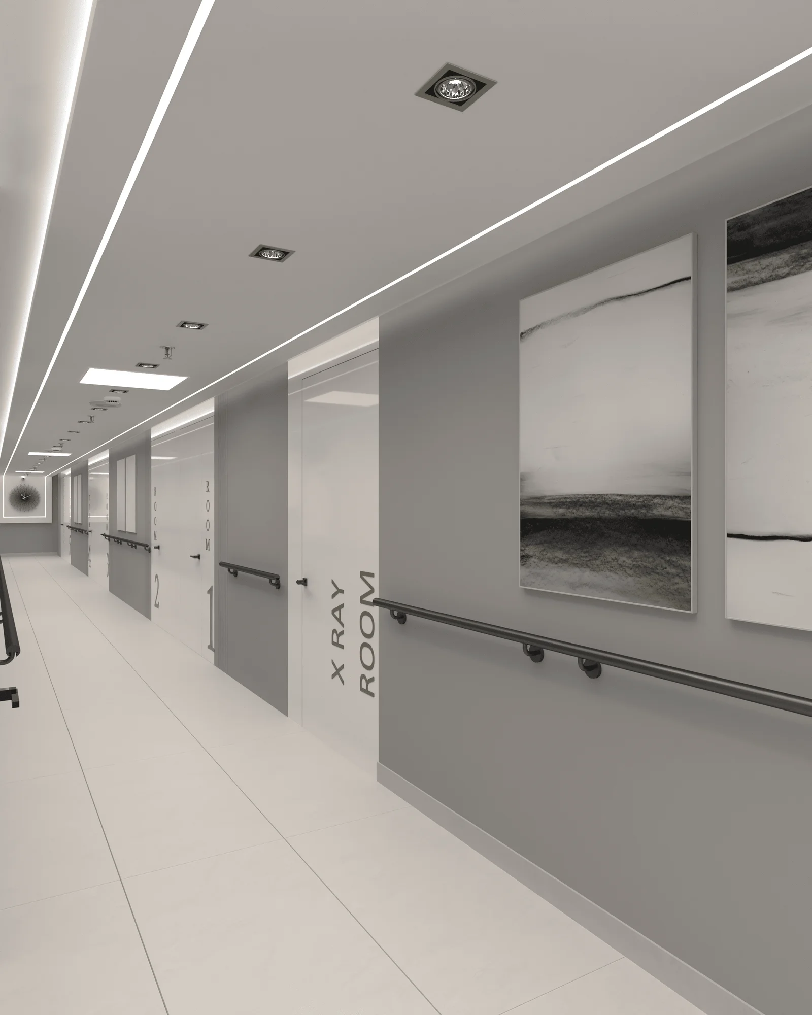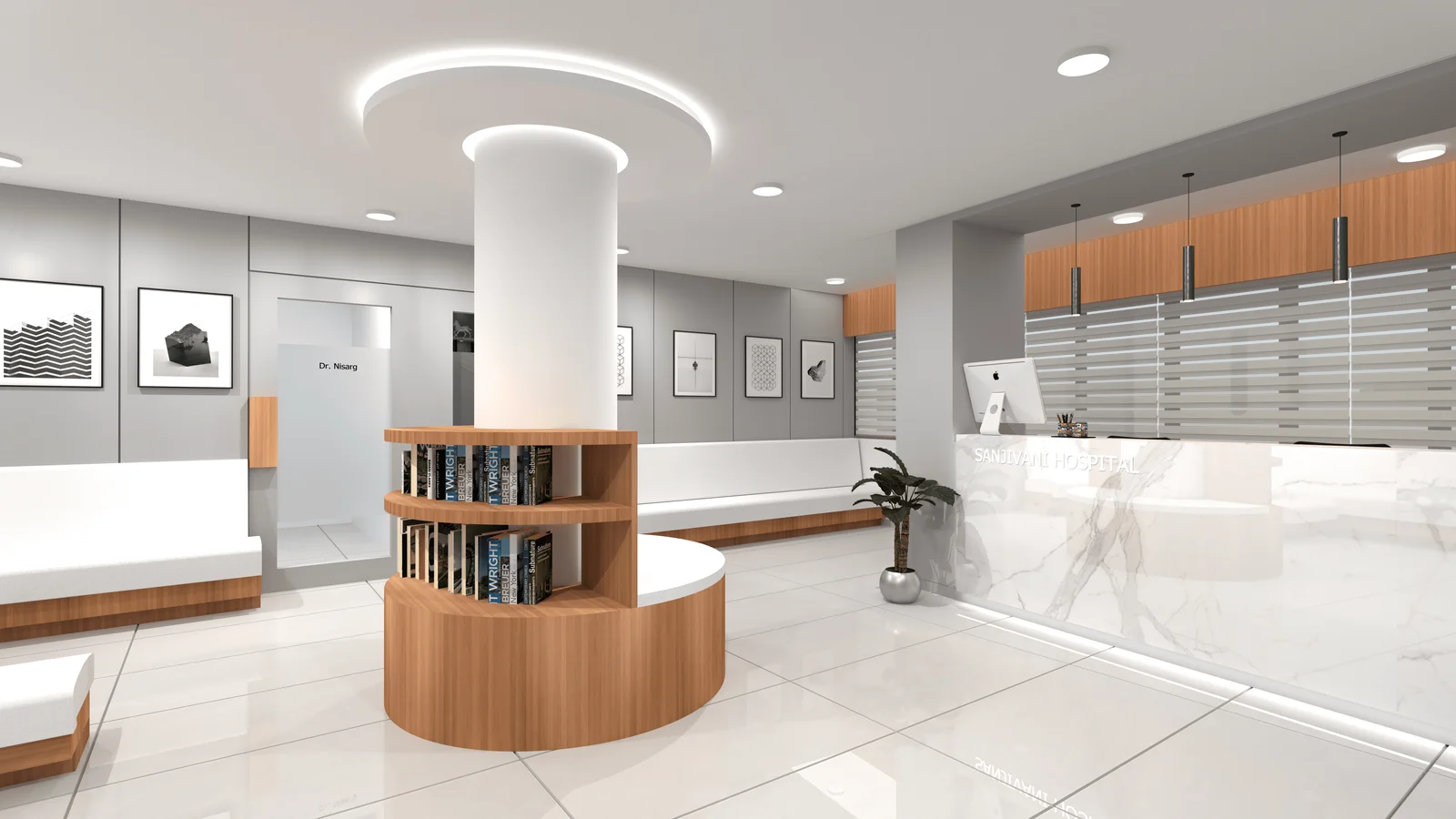 This project showcases the design of a modern hospital, prioritizing efficiency and patient comfort. The design incorporates a blend of warm wood tones, sleek white surfaces, and subtle grey accents to create a calming and professional atmosphere