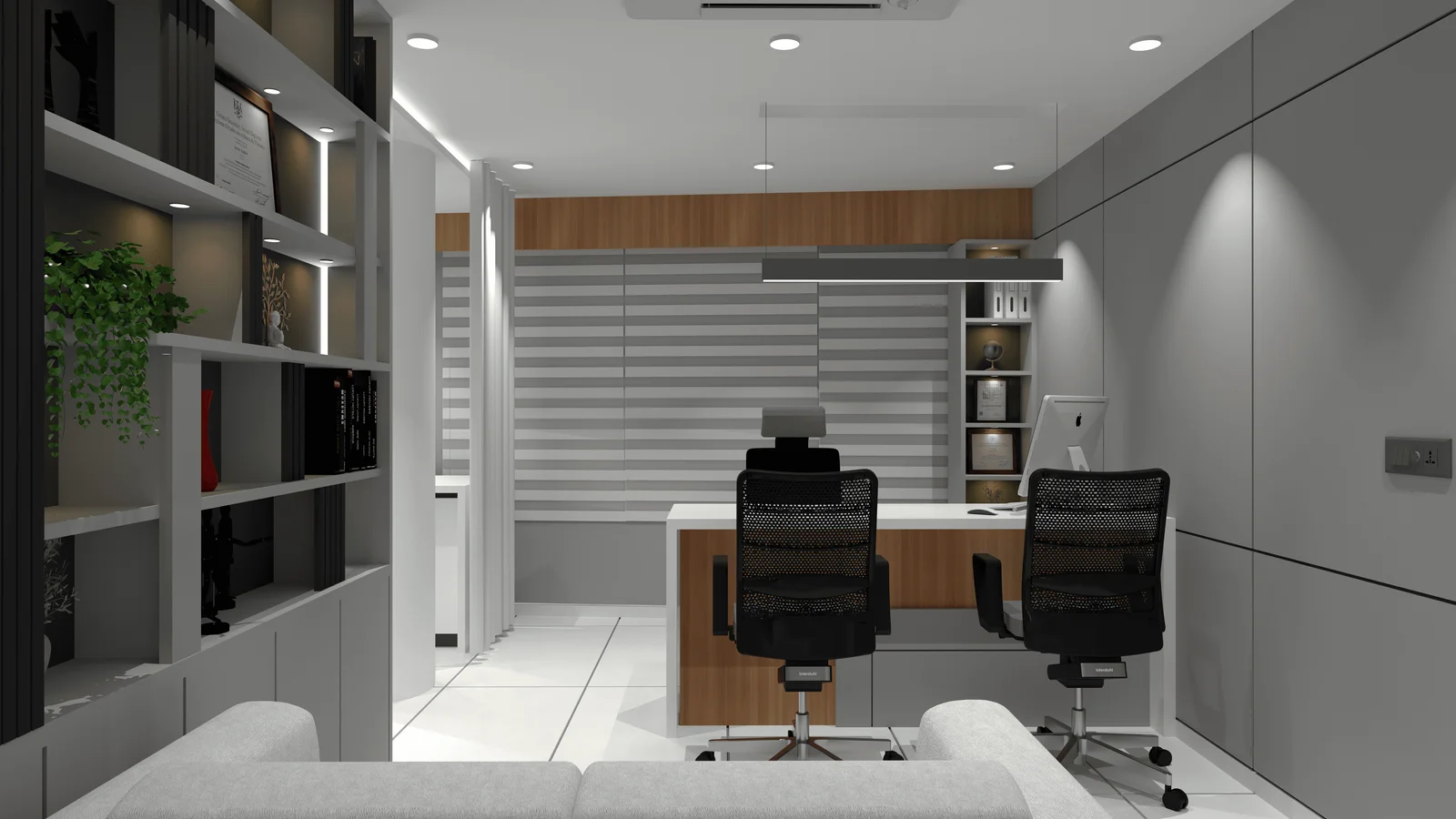 The use of warm wood tones and soft furnishings creates a welcoming and comfortable atmosphere for both the doctor and patients. The incorporation of natural light and strategically placed plants further enhances the sense of tranquility and well-being.