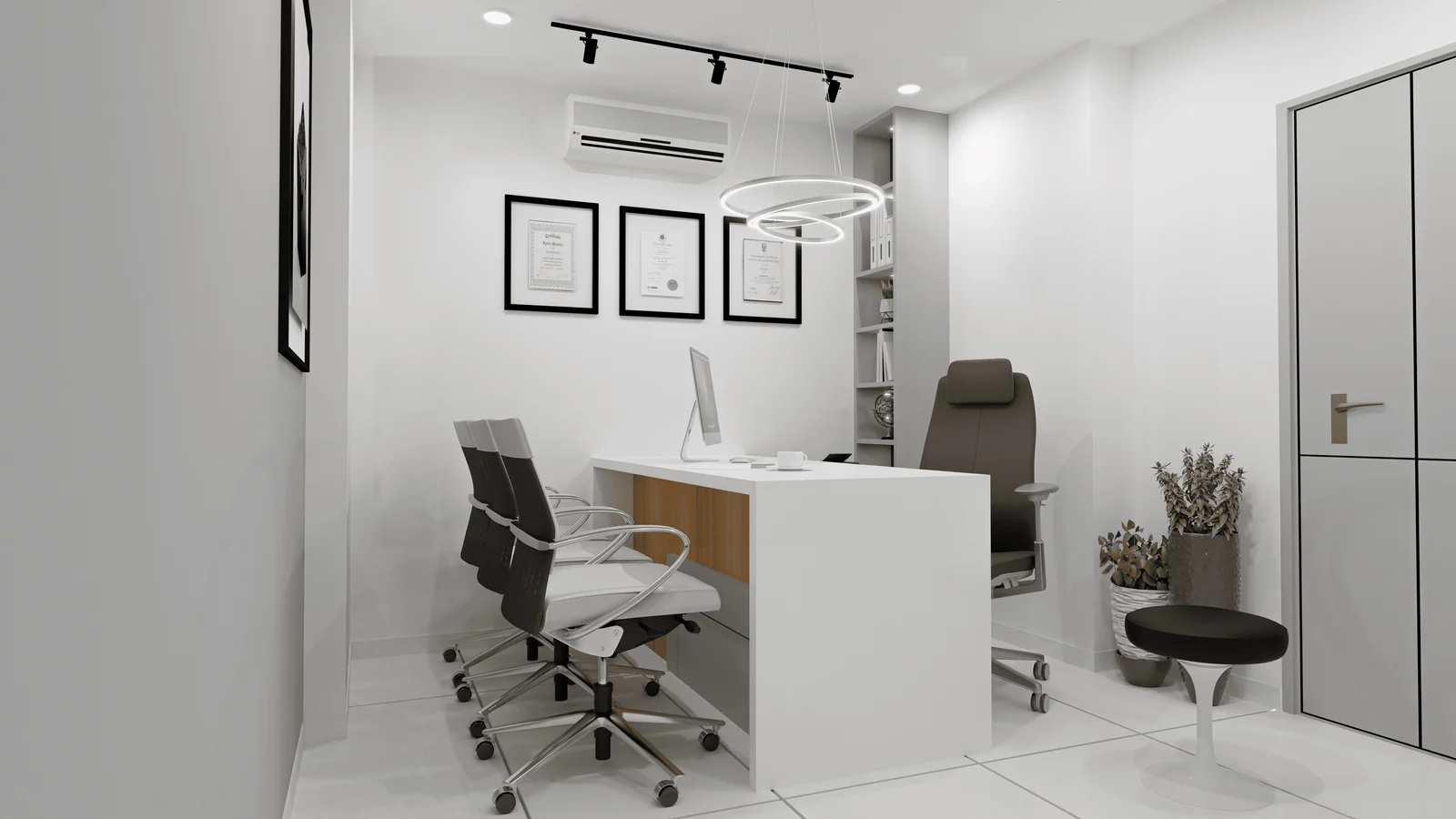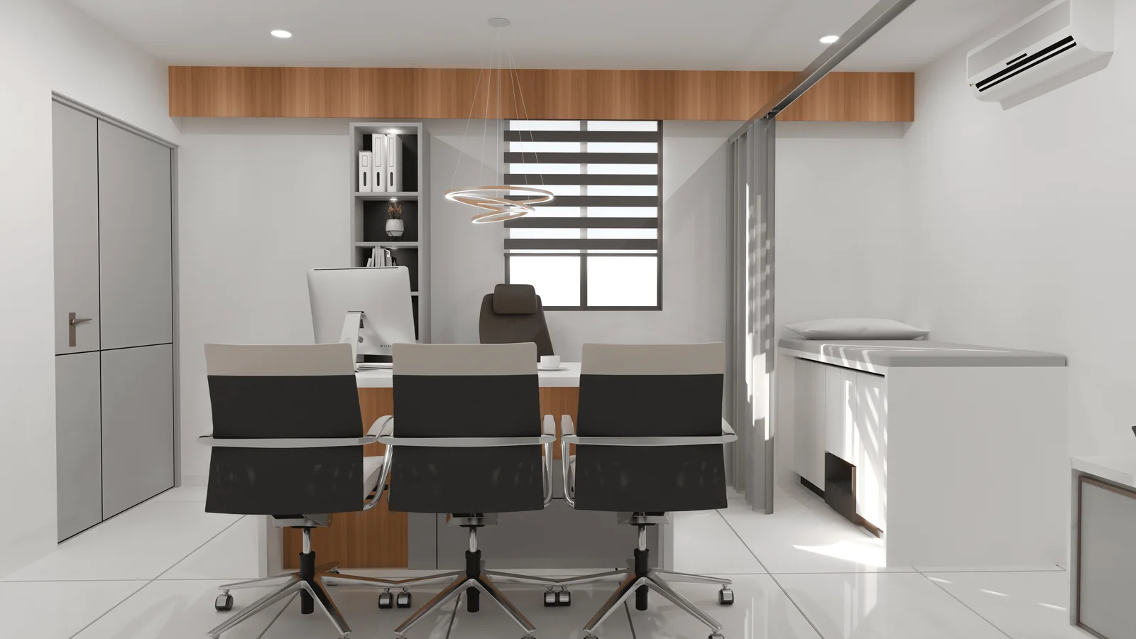 The space is thoughtfully planned with a focus on efficient workflow. The placement of the desk, patient seating area, and examination table ensures smooth movement and minimizes patient wait times.