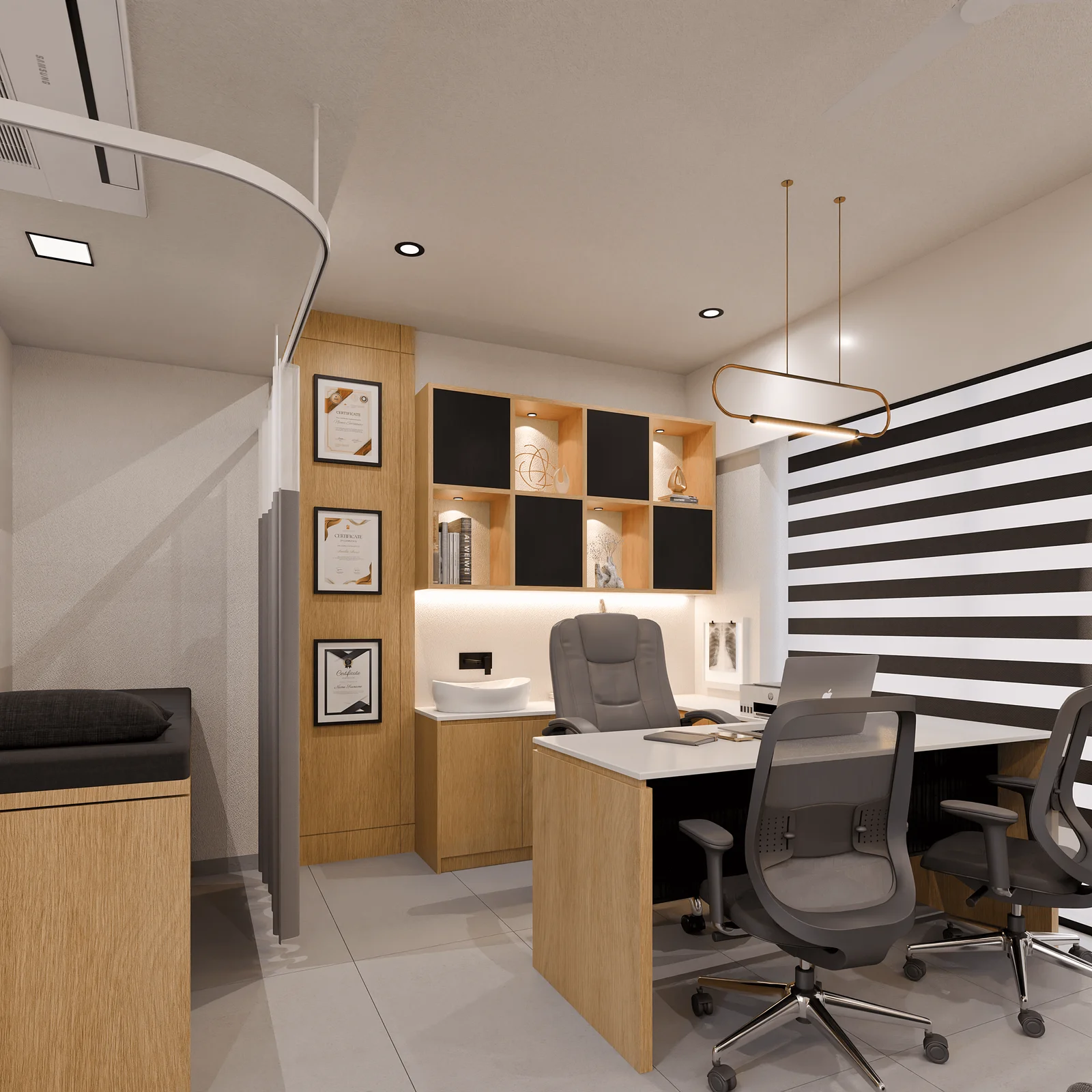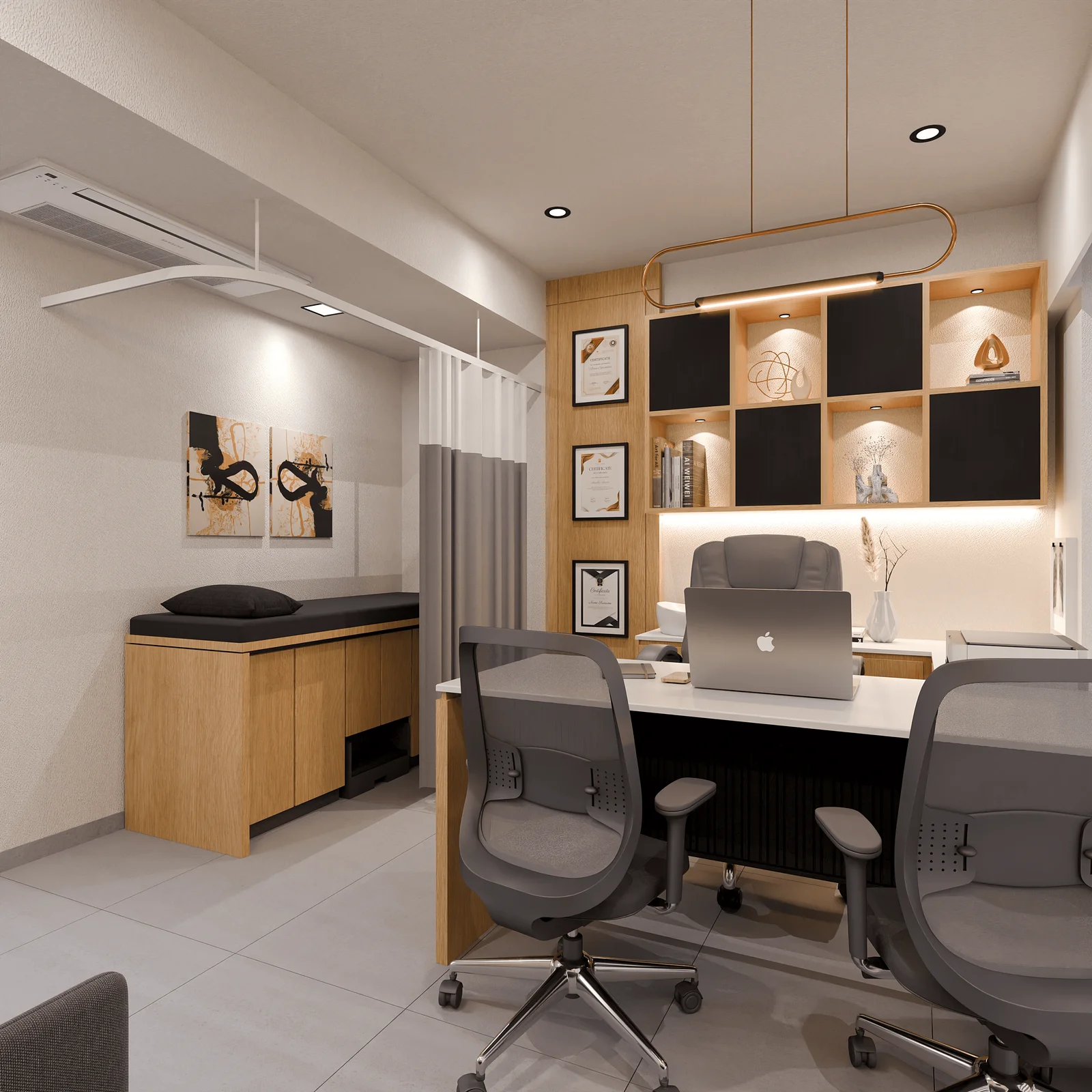 Display & Identity Wall: Featuring medical achievements, curated art, and ambient backlighting—establishing trust and professionalism.