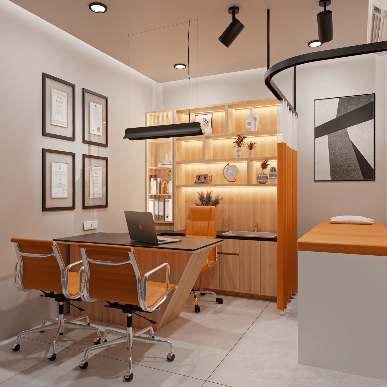 Each consultation space is designed for focus and flow. Warm wood tones meet contemporary lighting to create zones that feel personal, not procedural. A mix of display niches, soft textures, and custom-built millwork adds dimension to the compact footprint. Wall-mounted certifications and curated decor reinforce professionalism, while clean spatial divisions prioritise both patient privacy and functional storage.